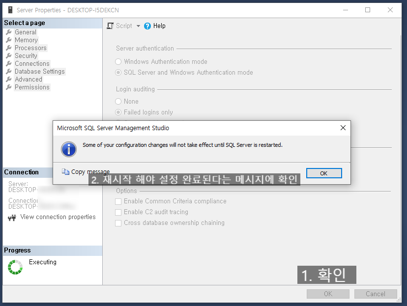 2. 시큐리티 페이지에서 서버 인증란란에서 SQL 서버 및 윈도우 인증 모드를 선택한다.